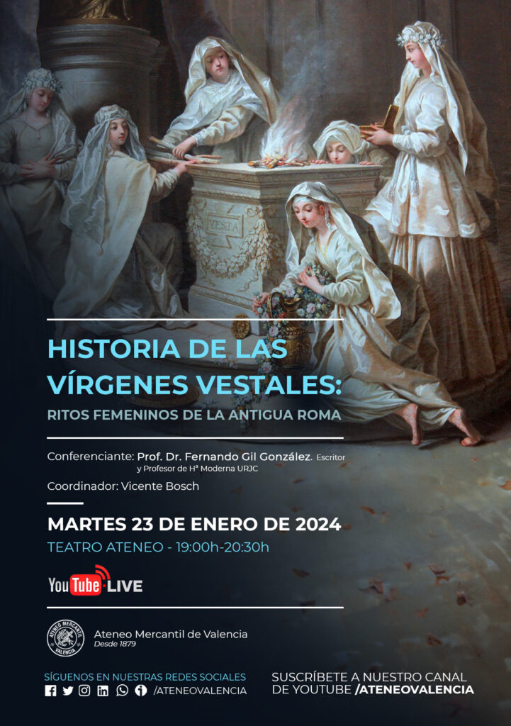 Esta conferencia nos sumerge en el intrigante mundo del antiguo sacerdocio romano conformado exclusivamente por mujeres consagradas a Vesta, que nos transporta a la Roma antigua, donde las vestales desempeñaban un papel crucial como guardianas del fuego sagrado y portadoras de una gran responsabilidad para el destino de la ciudad. Las vestales eran seleccionadas en la infancia y dedicaban al menos treinta años de su vida al servicio de las instituciones romanas, separadas de sus familias.