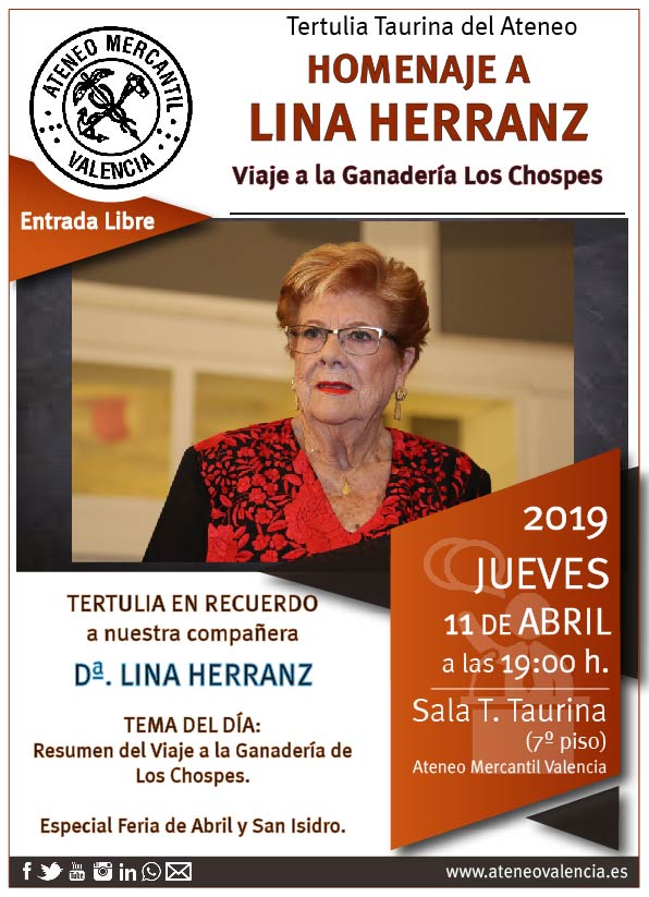 La Tertulia Taurina del Ateneo Mercantil de Valencia regresa este jueves a las 19 horas en el séptimo piso de nuestra casa con una Tertulia Homenaje a la compañera Dª. Lina Herranz. La primera hora estará dedicada a la memoria de la tertuliana taurina, mientras que en la segunda hora se hará un resumen del viaje del pasado domingo 7 y el lunes 8 de abril a Albacete con los comentarios de los tertulianos que estuvieron y se escogerá nueva fecha para completarlo, ya que debido a la lluvia que cayó en la ganaderia "Los Chospes" no se pudo completar el recorrido, así que tendrán la ocasión de participar en ese segundo viaje los que sí que viajaron y los que por algún motivo no pudieron asistir. Además, se hablará de las próximas Ferias de Sevilla y la de Madrid.