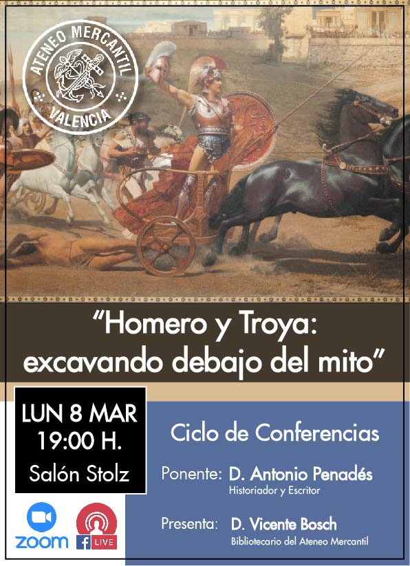 El Ciclo de Conferencias llega con una nueva ponencia que se celebrará en el Salón Stolz del Ateneo y se emitirá online por Zoom el próximo lunes 8 de marzo a las 19 horas bajo el título "Homero y Troya: excavando debajo del mito" y que impartirá el historiador y escritor, D. Antonio Penadés.