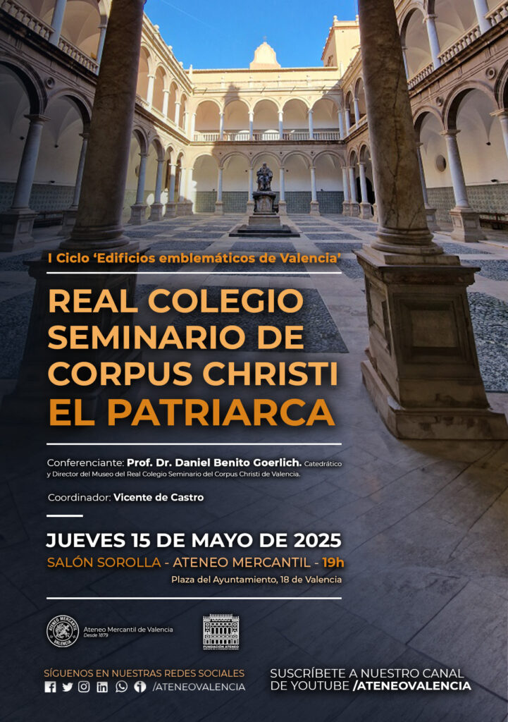 La ponencia estará a cargo del Prof. Dr. Daniel Benito Goerlich, Catedrático y Director del Museo del Real Colegio Seminario del Corpus Christi de Valencia, quien nos guiará por la historia, el arte y el legado de este monumento singular fundado en el siglo XVI por San Juan de Ribera, arzobispo de Valencia y patriarca de Antioquía.