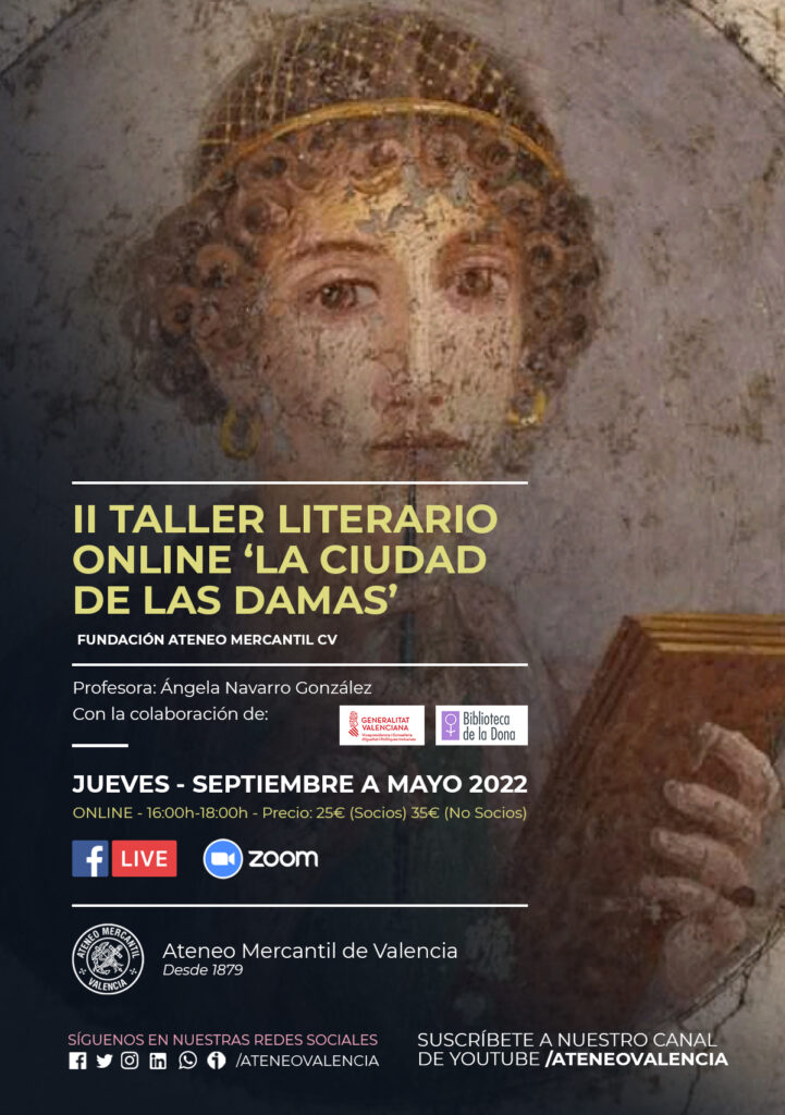 El segundo taller literario sobre mujeres y literatura 'La ciudad de las damas' organizado por la Fundación del Ateneo CV y en colaboración con la Generalitat Valenciana, la Conselleria de Igualdad y Políticas Inclusivas y la Biblioteca de la Dona regresa al Ateneo Mercantil de Valencia. El taller literario Online será de carácter mensual, nueve sesiones, de dos horas de duración cada una (de 16.00 a 18.00 horas), a desarrollar desde finales de septiembre hasta mayo de 2022, con un coste total de 35 euros y 25 euros (socios del Ateneo). Se buscan personas que quieran involucrarse en un proyecto apasionante.