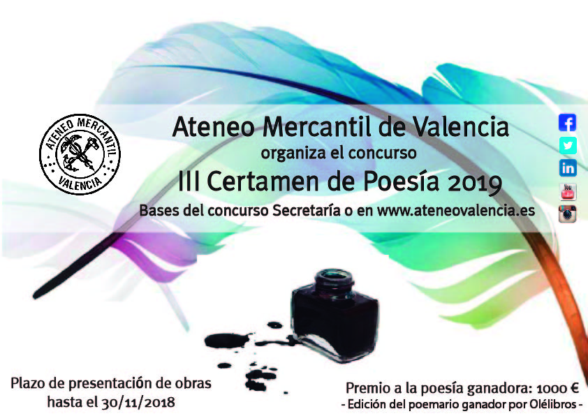 El Ateneo Mercantil celebra el tercer Certamen de Poesía "Ateneo Mercantil de Valencia". Un concurso que va ganando en importancia y se nota tanto en la cantidad como en la calidad de los poemas enviados en los últimos años. Este año existe la novedad en el premio del ganador ya que se duplica el montante económico y pasa de los 500 euros de otros años, a los 1.000 euros de este año. Además, se editará un libro con el poema ganador y la Revista del Ateneo Mercantil hará una entrevista al vencedor o vencedora. Los poemas que concursen deberán ser enviadas al Ateneo Mercanyil o entregadas en Secretaría. Lee las bases (las encontrarás a continuación) e infórmate bien para poder participar.