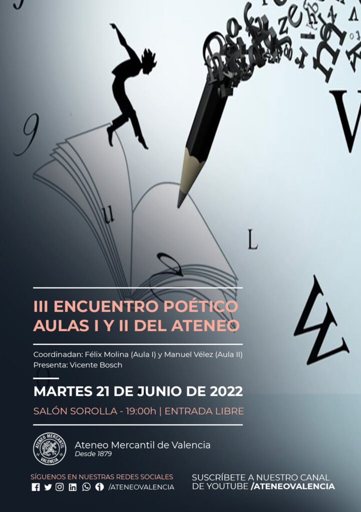 La poesía vuelve al primer plano en el Ateneo Mercantil de Valencia el próximo martes 21 de junio a las 19 horas en el Salón Sorolla (5ª planta) con el III Encuentro Poético de las Aulas de Poesía I y II del Ateneo. Un evento coordinado por los encargados del Aula I, Félix Molina, y la del II, Manuel Vélez. Presentará el acto el bibliotecario del Ateneo, Vicente Bosch. Entrada libre hasta completar aforo.