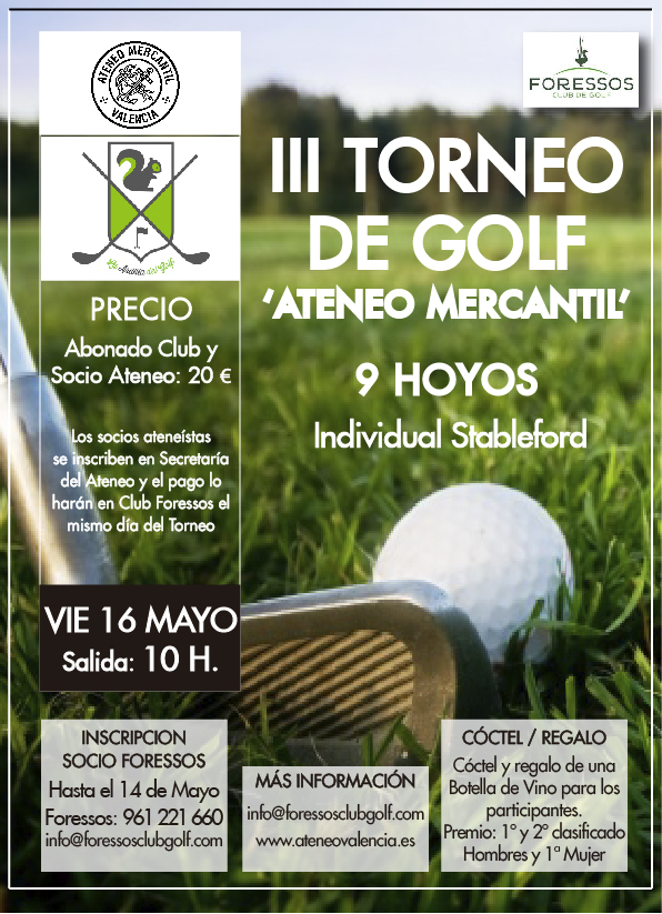 El Ateneo Mercantil de Valencia, en colaboración con el Foressos Club de Golf y La Ardilla del Golf, organiza el próximo viernes, 16 de mayo de 2025 de 10 a 14 horas su tercer torneo de golf en formato Individual Stableford, en uno de los entornos más agradables para los amantes del golf: el Foressos Club de Golf. ¡No te quedes fuera de esta experiencia única!