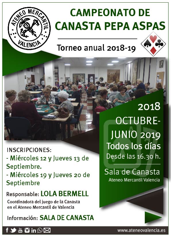 La responsable del Campeonato de Canasta ‘Pepa Aspas’ es la directiva y coordinadora de la Canasta en el Ateneo Mercantil, Lola Bermell. Para más información en la sala de canasta.