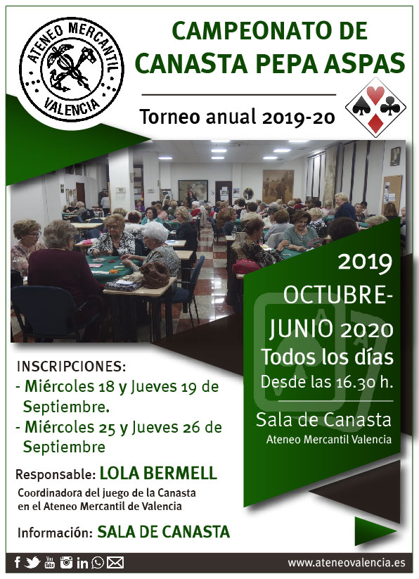 Estamos preparando una nueva edición del tradicional Campeonato de Canasta ‘Pepa Aspas’ 2019-20, con más jugadoras, mejores premios,... Un torneo que arrancará el próximo mes de octubre 2019 y durará hasta el mes de junio de 2020. Recuerda que el plazo de Inscripción se realizará los próximos días miércoles 18 y jueves 19 de septiembre y el miércoles 25 y jueves 26 de septiembre en la Sala de Canasta.