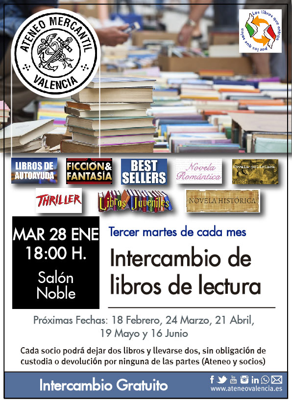 Este martes 28 de enero, de nuevo al Salón Noble (en la zona de cafetería), a las 18 horas comenzará el intercambio de libros totalmente gratuito para el socio ateneísta y durante dos horas podrás encontrar ese libro que tanto buscabas. Recuerda que todos los meses hay Intercambio Gratuito de Libros, para satisfacer el entusiasmo de los muchos amantes de la lectura que tenemos en nuestra casa. El tercer martes de cada mes de 18.00 a 20.00 horas en el Salón Noble tenemos una cita.