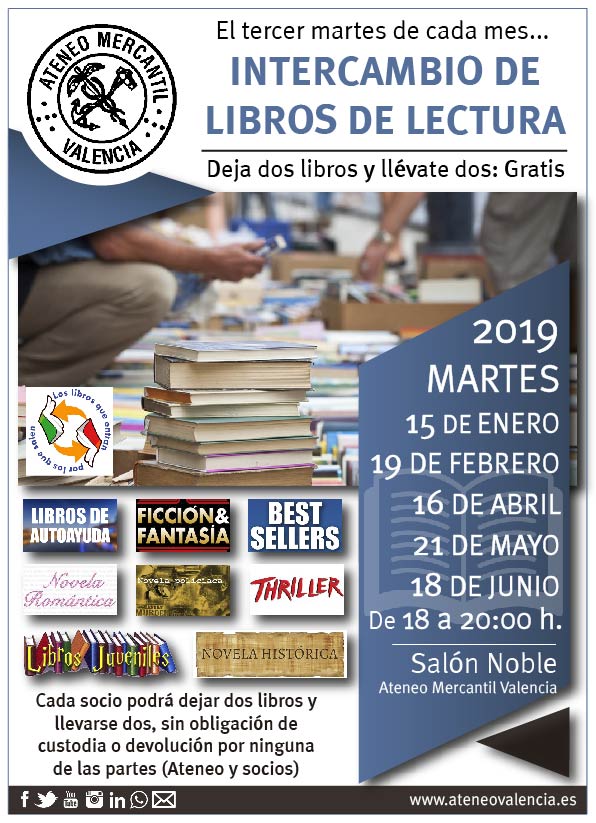 Último día del Intercambio de Libros antes de verano. Como todos los meses el Intercambio Gratuito de Libros para los socios del Ateneo Mercantil y que son amantes de la lectura es el tercer martes de cada mes de 18.00 a 20.00 horas en el Salón Noble. Realizaremos el intercambio de libros que te permitirá disfrutar de la lectura y ahorrar espacio en casa, además, de conseguir títulos nuevos sin gastar dinero. Recuerda que cada socio podrá dejar dos libros y llevarse dos, sin obligación de custodia o devolución por ninguna de las partes (Ateneo y socios).