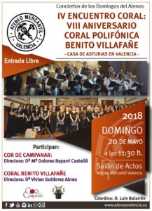 Regresan los Conciertos de los Domingos con el IV Encuentro Coral en el Ateneo Mercantil de Valencia. Los dos coros invitados son la Coral Polifónica Benito Villafañe 'Casa de Asturias en Valencia' bajo la batuta de su directora Dª Vivian Gutiérrez Abreu, y que celebran su octavo aniversario y el Cor de Campanar que llega con su directora Dª María Dolores Bayarri Castelló. El título del concierto es IV ENCUENTRO CORAL: VIII ANIVERSARIO CORAL POLIFÓNICA BENITO VILLAFAÑE.