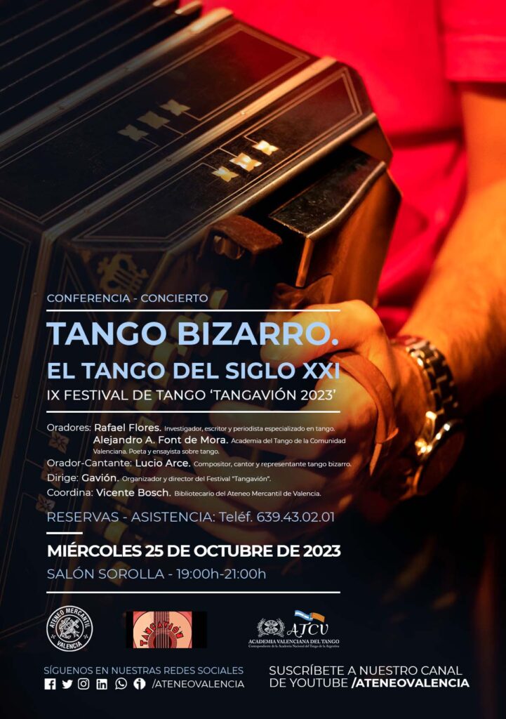 En la primera jornada, la del 25 de octubre, a las 19 horas tendremos la conferencia "Tango Bizarro. El Tango del siglo XXI" con dos oradores de enorme prestigio como son D. Rafael Flores, investigador, escritor y periodista especializado en tango y D. Alejandro A. Font de Mora. Academia del Tango de la Comunidad Valenciana. Poeta y ensayista sobre tango. Además, contaremos con el orador-cantante: D. Lucio Arce, compositor, cantor y representante tango bizarro. Dirige el evento: D. Gavión, organizador y director del Festival "Tangavión" y coordina: D. Vicente Bosch, bibliotecario del Ateneo Mercantil de Valencia.