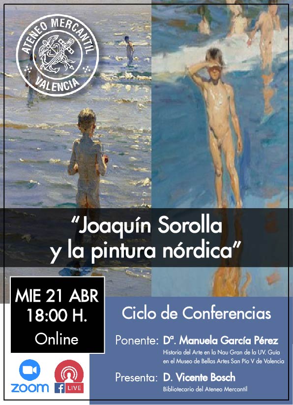 Nueva conferencia de Dª. Manuela García en el Ateneo Mercantil tras su éxito con el Grito de Munch. En esta ocasión realizará una conferencia online el próximo miércoles 21 de abril a las 18 horas sobre el mejor pintor valenciano de la historia como es Joaquín Sorolla. Llega bajo el título "Joaquín Sorolla y la pintura nórdica". Dª. Manuel Garacía es especialista en Historia del Arte en la Nau Gran de la Universitat de València y guía en el Museo de Bellas Artes San Pío V de Valencia.