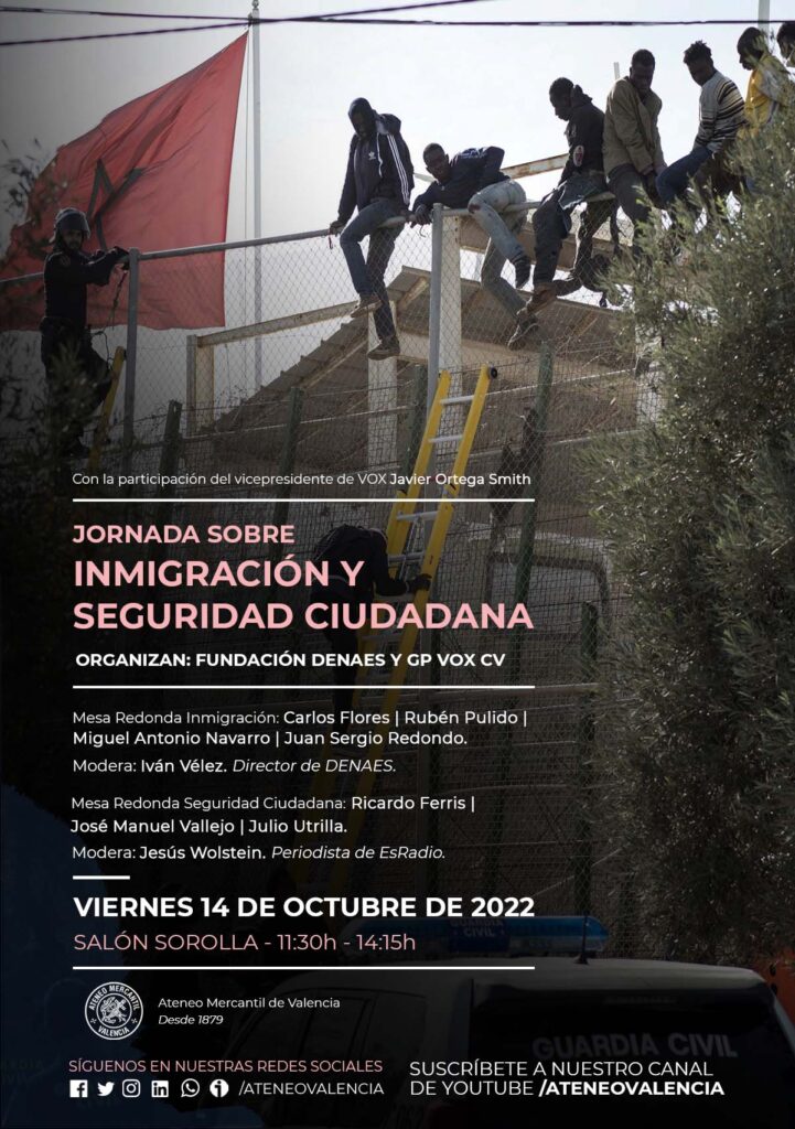 El próximo viernes 14 de octubre, la Fundación DENAES, en colaboración con el GP Vox en las Cortes Valencianas organizan una nueva jornada de debates en la que se tratará la Inmigración y la Seguridad Ciudadana. En esta jornada participará el vicepresidente de VOX, Javier Ortega Smith, y tendrá lugar en el Salón Sorolla del Ateneo Mercantil de Valencia.