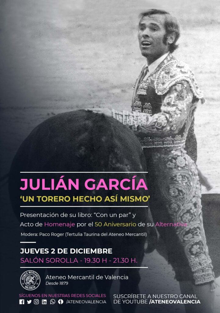 El Ateneo Mercantil de Valencia acoge el próximo jueves 2 de diciembre a las 19.30 horas en el Salón Sorolla la presentación del libro de Julián García "Con un par" y, de paso, se homenajeará al diestro con motivo del 50 aniversario de su Alternativa. El libro de Julián repasa su vida y la carrera de un torero que se hizo a sí mismo y que llegó a lo más alto, siendo durante varias temporadas un fijo en las ferias más importantes de nuestro país. Modera el acto, Francisco Roger, miembro de la directiva de la Tertulia Taurina del Ateneo. El libro "Con un par" está editado por Avance Taurino y dirigida por Paco Delgado, director de Avance Taurino.