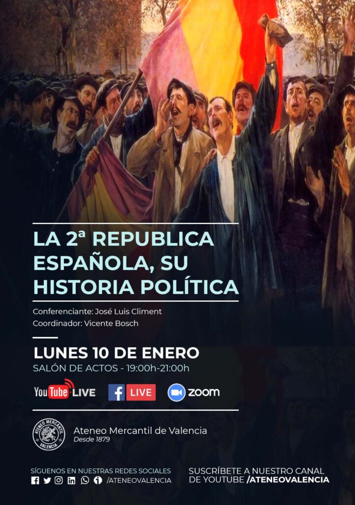 El Ciclo de Tertulias llega con una nueva conferencia sobre la Segunda República Española el próximo lunes 10 de enero a las 19 horas en el Salón de Actos del Ateneo Mercantil. El ponente será el coordinador de la Tertulia Histórica en nuestra institución, D. José Luis Climent y llega bajo el título: "La 2ª República Española, su historia política".