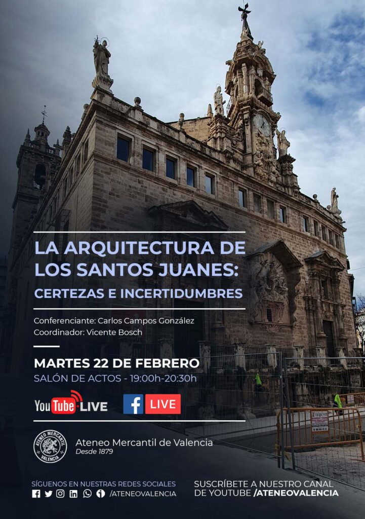 El Ciclo de Conferencias llega el próximo martes 22 de febrero a las 19 horas en el Salón de Actos del Ateneo Mercantil con una conferencia sobre la arquitectura de una de las iglesias más antiguas de la ciudad de Valencia. El arquitecto encargado de la reforma de los Santos Juanes de Valencia, Carlos Campos González, nos trae la conferencia "La arquitectura de los Santos Juanes: certezas e incertidumbres".
