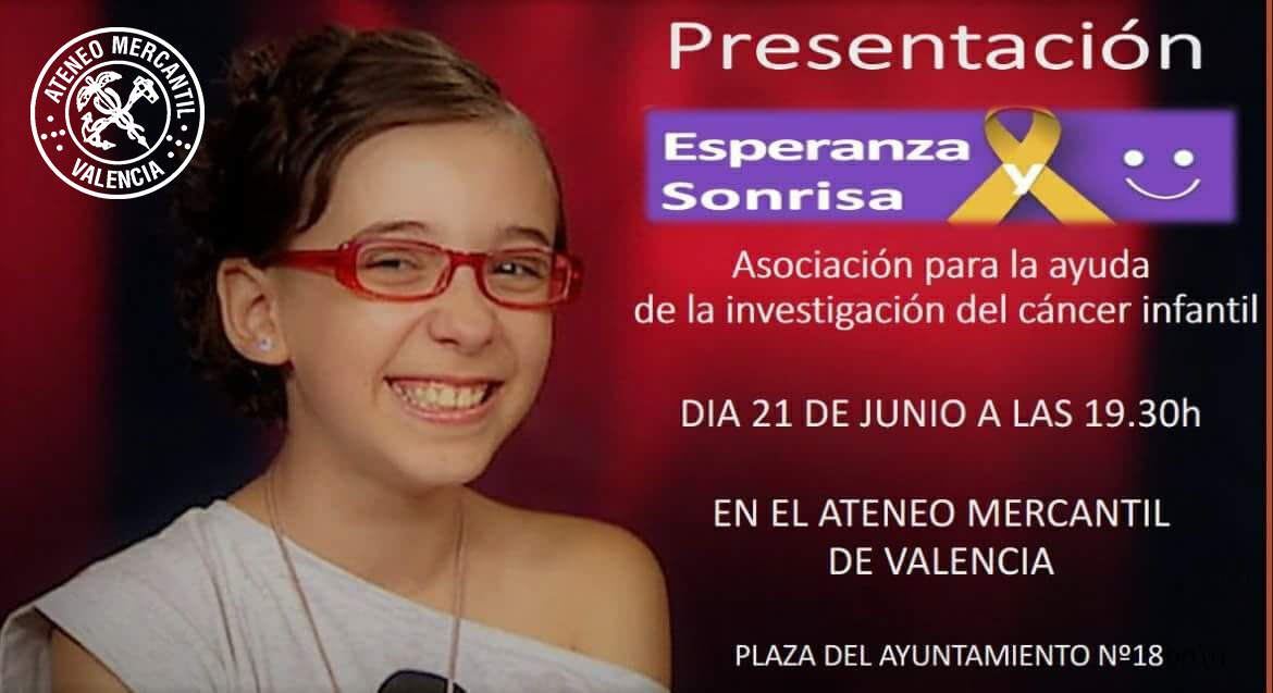 El Ateneo Mercantil de Valencia es el lugar escogido para la presentación de la asociación “Esperanza y Sonrisa”, cuyo objetivo es la ayuda para la investigación del cáncer infantil. Esta Asociación está fundada por Amparo Ruiz, madre de Iraila, la niña valenciana que participó en el programa de televisión “La Voz Kids" y que falleció a causa de un cáncer mientras todavía se emitía el programa. Será en el Salón Sorolla a las 19.30 horas.