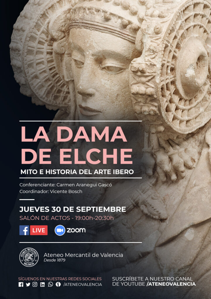 El Ciclo de Conferencias del Ateneo Mercantil de Valencia trae el próximo miércoles 30 de septiembre a las 19 horas en el Salón de Actos, una ponencia muy especial, ya que se cumplen 125 años del descubirmiento de la Dama de Elche y nuestra institución para celebrar esta efeméride realiza una conferencia con la arqueóloga, Carmen Aranegui Gascó, una de las personas que más conocimiento tiene sobre el Arte Ibero y sobre la Dama de Elche. La conferencia llega bajo el título "La Dama de Elche. Mito e historia del Arte Ibero".