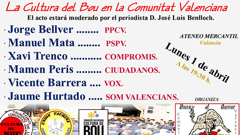 La Federación de Peñas Taurinas de Bous al Carrer de la Comunidad Valenciana, organiza un coloquio político-taurino que se celebrará este lunes 1 de abril en el Salón Stolz del Ateneo Mercantil, en vísperas a las próximas Elecciones Nacionales, Autonómicas y Municipales y contará con los principales fuerzas políticas de nuestra ciudad y comunidad autónoma: PSPV, PPCV, Compromís, Ciudadanos, Som Valencians y VOX.