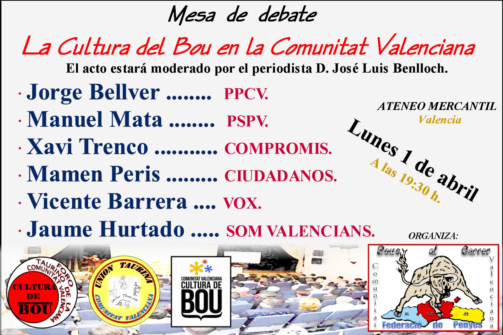 El objetivo del colectivo taurino ya no es dar a conocer a la sociedad quienes son, lo que representan o como actúan; toda la sociedad valenciana conoce ya su trayectoria. Su objetivo en la próxima legislatura y con la ayuda de la nueva Administración es, la de consolidar la “Cultura del Bou” que vertebra de norte a sur la Comunidad Valenciana. Para ello y con el objetivo de dar a conocer de primera mano a todo el colectivo taurino, las ideas y apuestas de futuro respecto a Tauromaquia, de todos los partidos políticos de la Comunitat Valenciana han convocado una Mesa de Debate político-taurina que será moderada por el periodista taurino D. José Luis Benlloch y que contará con los siguientes partipantes: