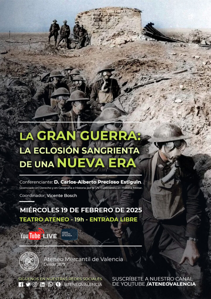 El Ateneo Mercantil de Valencia tiene el placer de invitarles a la conferencia titulada "La Gran Guerra: la eclosión sangrienta de una nueva era", que impartirá D. Carlos-Alberto Precioso Estiguín, Licenciado en Derecho y en Geografía e Historia por la Universitat de València. Especialista en Historia Militar.