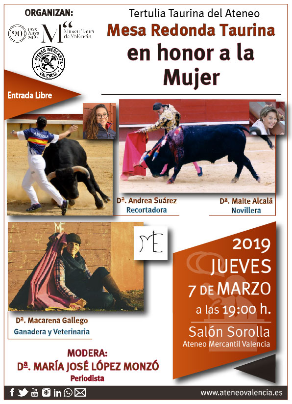 La Tertulia Taurina del Ateneo Mercantil de Valencia ha organizado para celebrar el Día de la Mujer una mesa redonda en torno a la presencia de la misma en la fiesta nacional. El próximo jueves, 7 de marzo, a las 19 horas en el Salón Sorolla se celebrará una mesa redonda en que se abordará la participación en la fiesta y el papel que realiza en la actualidad la mujer en los toros. La mesa redonda será moderada por la periodista Mª José López Monzó y contará con la presencia de la recortadora Andrea Suárez, la novillera Maite Alcalá y la ganadera y veterinaria Macarena Gallego.