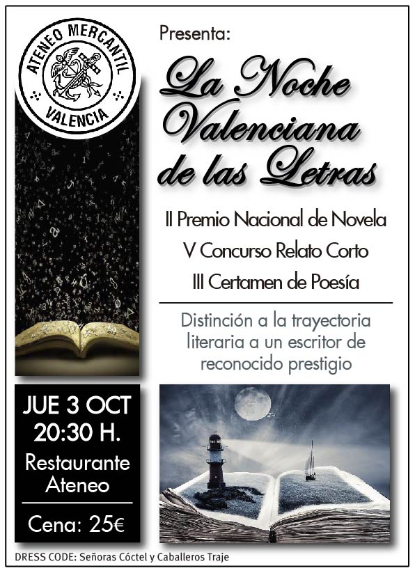 Será una noche especial, en la que las letras serán las protagonistas. Literatura en prosa y en verso, en tres modalidades fue arraigadas en nuestra cosa como es la Novela, el Relato Corto y la Poesía. Una Gala Literaria en la que se premiarán a los tres mejores trabajos del año 2019 y que mostrará la fuerza que tiene el Ateneo Mercantil y Valencia en el panorama nacional de las letras, ya que han sido muchos los que han buscado inscribir sus nombres en los galardones de estos tres concursos nacionales.