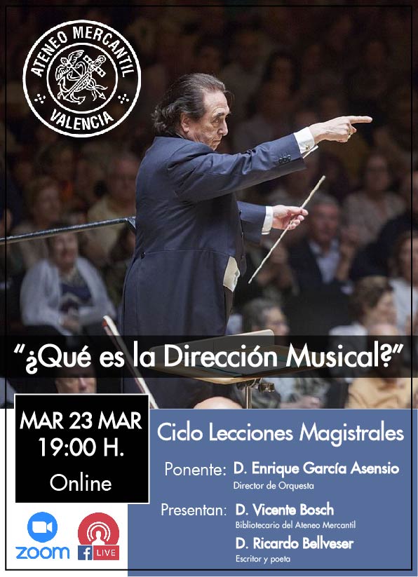 El Ciclo Lecciones Magistrales regresa el próximo martes 23 de marzo a las 19 horas con la conferencia online del director de orquesta, D. Enrique García Asensio, bajo el título "¿Qué es la Dirección Musical?". El acto será presentado por el bibliotecario del Ateneo Mercantil, D. Vicente Bosch y por el escritor y poeta, D. Ricardo Bellveser.