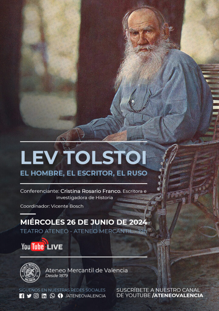 El Ciclo de Conferencias del Ateneo Mercantil trae la historia de Lev Tolstoi. Hijo de una familia aristocrática, se quedó huérfano muy pronto y lo acogieron sus tías. En 1843 fue a la Universidad de Kazán y después ingresó en el ejército. Al estallar la guerra de Crimea (1853) marchó al frente, del que regresó decidido a consagrarse a la literatura.