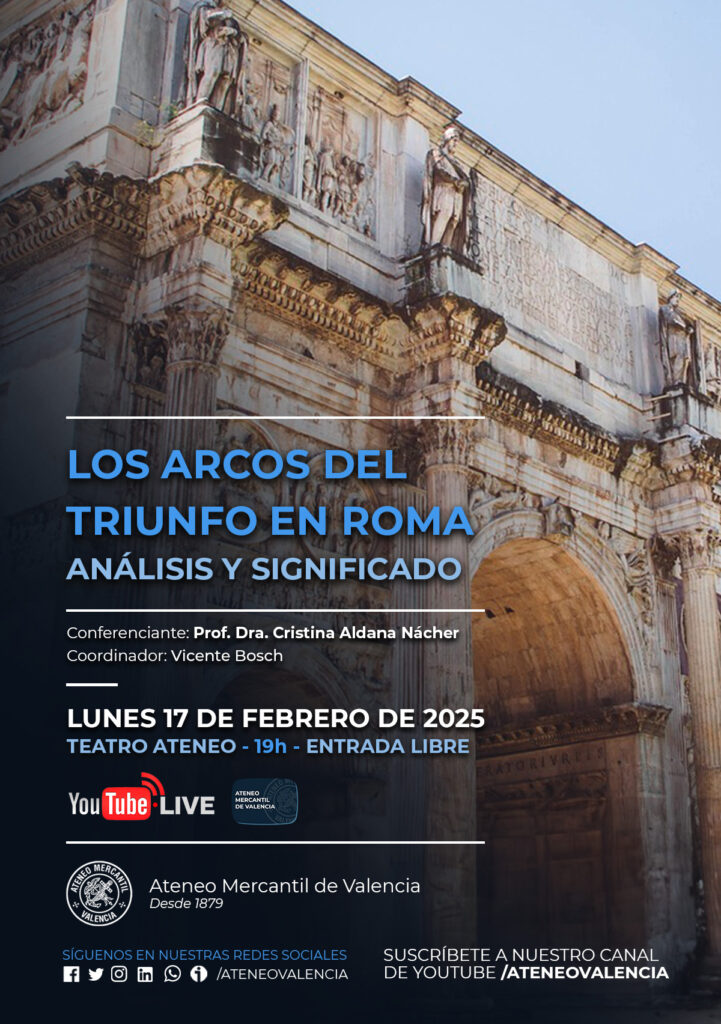 El Ateneo Mercantil de Valencia tiene el placer de invitarles a una nueva conferencia sobre la arquitectura romana: "Los arcos de triunfo en Roma. Análisis y significado". Uno de los monumentos más emblemáticos de la arquitectura romana son los arcos de triunfo, estructuras aparentemente sencillas, pero de gran simbolismo. Aunque existieron muchos en la ciudad de Roma, en la actualidad solo se conservan completos tres de ellos: el Arco de Tito, el Arco de Septimio Severo y el Arco de Constantino, todos de gran valor estético e iconográfico.