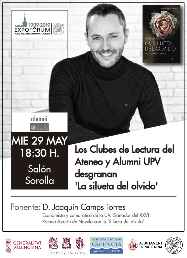 El próximo miércoles 29 de mayo a las 18.30 horas se celebrará la proxima reunión de los Clubes de Lectura del Ateneo Mercantil de Valencia junto al Club de Lectura de la UPV, donde contarán con la presencia del autor D. Joaquín Camps, para comentar su obra "La silueta del olvido" dentro del marco de Expoforum Valencia 2019. "La silueta del olvido" es una intriga policiaca ambientada en la ciudad de Valencia cuya protagonista es una inspectora de la Policía, Claudia Carreras, con una cojera y que padece "aún más cuando está enfrente de un chico que le gusta", según ha desvelado el autor.