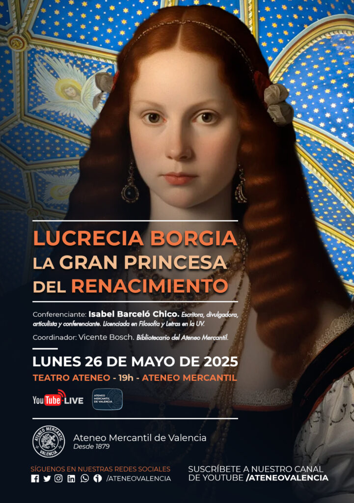 El Ateneo Mercantil de Valencia organiza una nueva conferencia histórica en la que se pondrá el foco sobre una figura femenina clave como fue la de la hija del papa valenciano Alejandro VI. Una ponencia a cargo de Isabel Barceló Chico, escritora, divulgadora, articulista y licenciada en Filosofía y Letras por la Universitat de València.