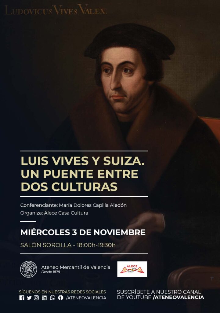 El próximo miércoles 3 de noviembre en el Salón Sorolla del Ateneo Mercantil (5ª planta) se celebrará a las 18 horas la conferencia "Luis Vives y Suiza. Un puente entre dos culturas" que organiza Alece Casa Cultura, plataforma cultural para el desarrollo de la lengua, arte y cultura española, con la participación de Dª. María Dolores Capilla Aledón, Cónsul Honoraria de España en el Cantón Tesino (Suiza) y fundadora de Casa Cultura.