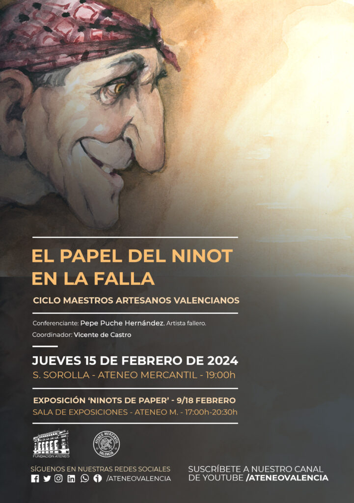 La Fundación del Ateneo Mercantil de la CV organiza una nueva conferencia que se enmarca en el Ciclo Maestros Artesanos Valencianos y que llega bajo el título "El papel del ninot en la falla" cuyo ponente será el artista fallero Pepe Puche Hernández. Una conferencia que coincidirá en el tiempo con la Exposición 'Ninots de Paper' que la familia Puche montará del 9 al 18 de febrero en la Sala de Exposiciones del Ateneo.