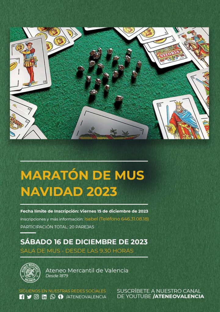 Ya está abierto el plazo de inscripción para el Maratón de Mus "Navidad 2023" que todos los años se celebra en el Ateneo con gran acogida de socios. El torneo se celebrará el sábado 16 de diciembre desde las 9:30 hasta las 20 horas en Juegos (2º piso), así que, si sabes jugar al mus, no dudes en apuntarte.