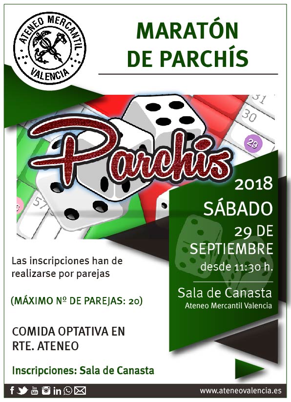 Llega de nuevo un Maratón de Parchís cuyas inscripciones han de realizarse por parejas. El torneo se disputa con un máximo de 20 parejas. El sábado 29 de septiembre, a partir de las 11.30 horas de mañana se disputará el maratón. Las inscripciones se realizarán en la Sala de Canasta y hay posibilidad de quedarse a comer en el Restaurante del Ateneo Mercantil. Si quiere más información debe contactar con Lola Bermell, responsable del Parchís y de la Canasta en el Ateneo Mercantil.