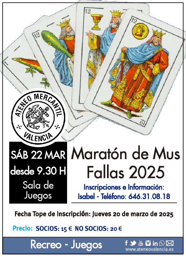 Ya está abierto el plazo de inscripción para el Maratón Open de Mus "Fallas 2025", un evento con gran acogida entre los socios del Ateneo. Si sabes jugar al mus, no dudes en apuntarte.