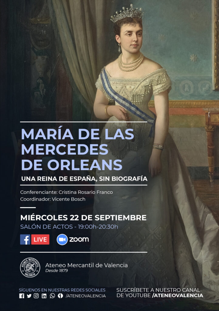 El Ciclo de Conferencias del Ateneo Mercantil trae la historia de una de las grandes reinas olvidadas por la historia, María de las Mercedes de Orleans y Borbón, el próximo miércoles 22 de septiembre a las 19 horas en el Salón de Actos. La ponencia llega bajo el título "María de las Mercedes de Orleans. Una reina de España, sin biografía" y la ponente será la escritora e investigadora histórica, Cristina Rosario Franco.