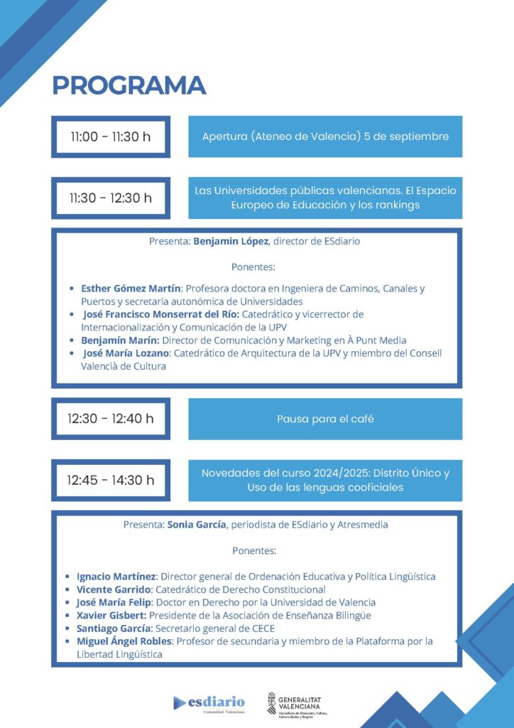 Presenta: Sonia García, periodista de ESdiario y Atresmedia. Ponentes: D. Ignacio Martínez. Director general de Ordenación Educativa y Política Lingüística. Dr. D. Vicente Garrido. Catedrático de Derecho Constitucional. Dr. D. José María Felip. Doctor en Derecho por la Universidad de Valencia. D. Xavier Gisbert. Presidente de la Asociación Enseñanza Bilingüe. D. Santiago García. Secretario general de CECE.