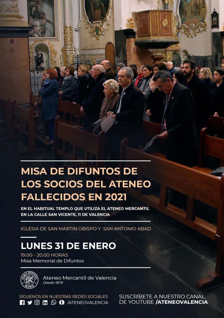 El Ateneo Mercantil de Valencia rinde un sentido homenaje con una misa en recuerdo de sus socios fallecidos a lo largo del año pasado, un año, el 2021 que ha golpeado de lleno a la sociedad valenciana, sobre todo en los primeros meses, como también ocurriera en 2020. La de Misa de Difuntos está dedicada a todos los socios ateneístas que faltaron a lo largo del año anterior y este 31 de enero a las 19 horas se realizará como es habitual en la iglesia de San Martín Obispo y San Antonio Abad, el templo que utiliza nuestra institución para los actos religiosos, que está situado en la calle San Vicente, 11 de Valencia.