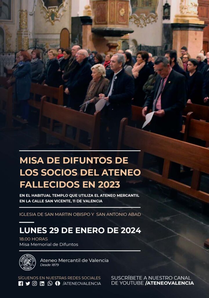 El Ateneo Mercantil de Valencia rinde un sentido homenaje con una misa en recuerdo de sus socios fallecidos a lo largo del año pasado año 2023. La Misa de Difuntos está dedicada a todos los socios ateneístas que faltaron a lo largo del pasado año; así este lunes 29 de enero a las 18 horas tienen una cita en la iglesia de San Martín Obispo y San Antonio Abad, el templo que utiliza nuestra institución para los actos religiosos, que está situado en la calle San Vicente, 11 de Valencia.