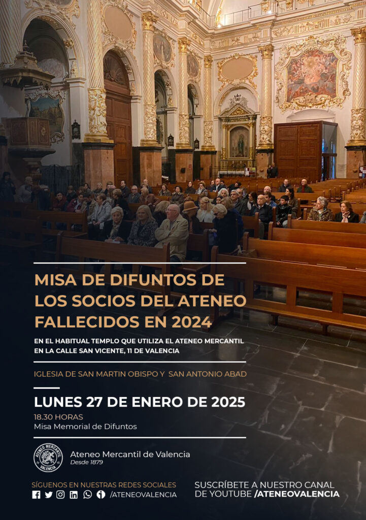 El Ateneo Mercantil de Valencia invita a sus socios, familiares y amigos a la Misa Memorial de Difuntos en recuerdo de todos los socios fallecidos durante el año 2024.