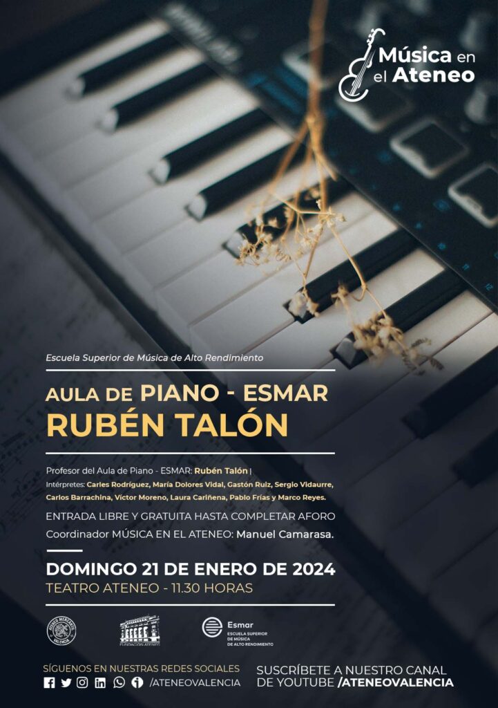 La Fundación del Ateneo Mercantil de la CV en colaboración con la Escuela Superior de Música de Alto Rendimiento ESMAR organizan un nuevo concierto gratuito dentro del Ciclo Música en el Ateneo en la que nos traen a los alumnos del Aula de Piano ESMAR - Rubén Talón hasta el Teatro Ateneo.
