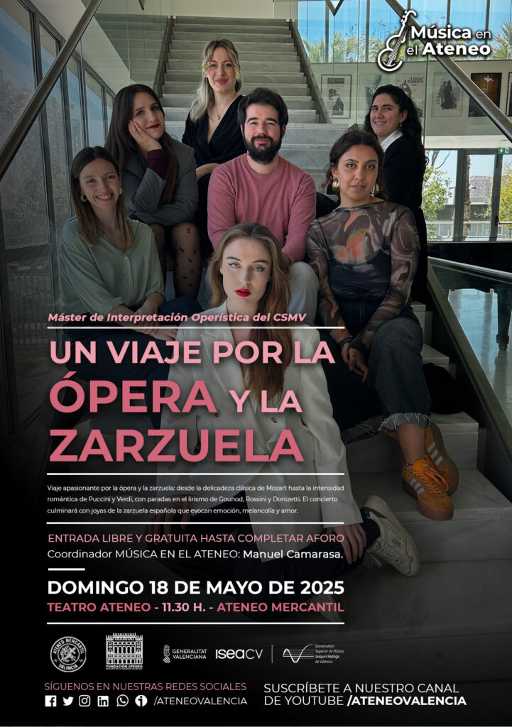 La Fundación Ateneo Mercantil de la Comunidad Valenciana organiza un nuevo concierto gratuito dentro del Ciclo Música en el Ateneo el próximo domingo 18 de mayo a las 11.30 horas en el Teatro Ateneo. En esta ocasión se celebrará un concierto de Ópera y Zarzuela por los alumnos del Máster de Interpretación Operística del Conservatorio Superior de Música de Valencia.