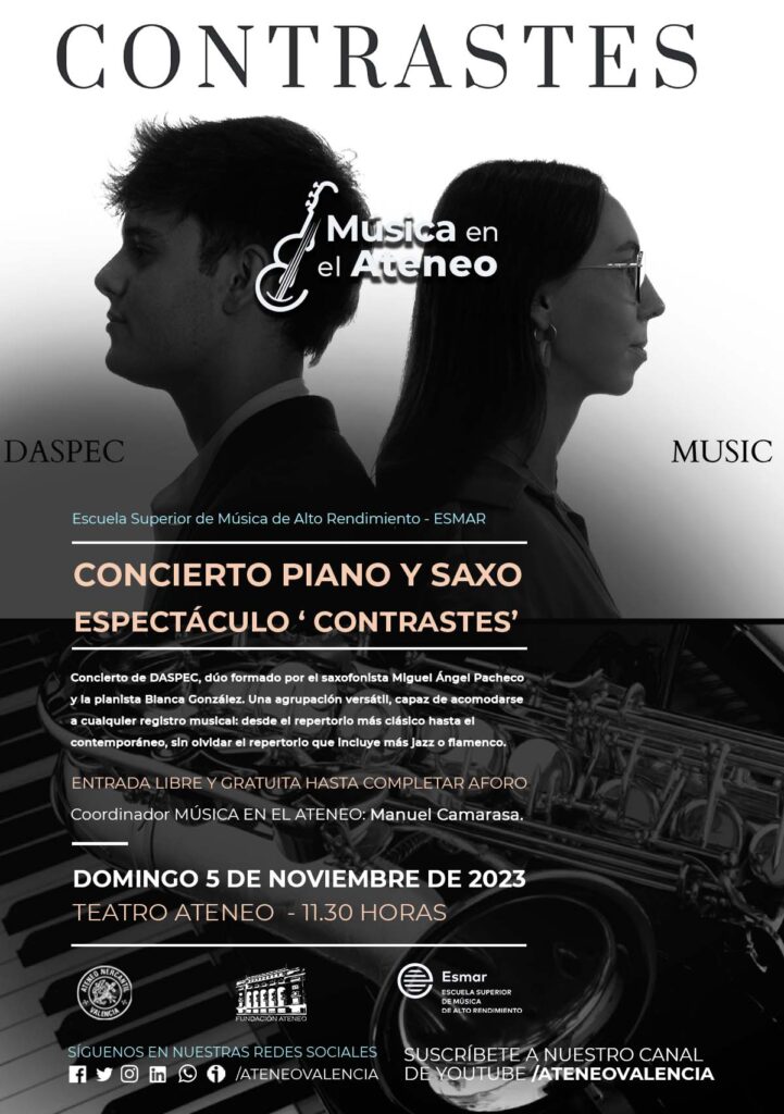 La Música en el Ateneo que organiza la Fundación Ateneo Mercantil CV con la colaboración de ESMAR, la Escuela Superior de Música de Alto Rendimiento, ha preparado un concierto gratuito de piano y saxofón para el próximo domingo 5 de noviembre a las 11.30 horas en el Teatro Ateneo. Un espectáculo que llega bajo el título 'Contrastes' y en el que podremos ver a DASPEC, un dúo formado por dos jóvenes de primer nivel como son Blanca González al piano y Miguel Ángel Pacheco al saxo.