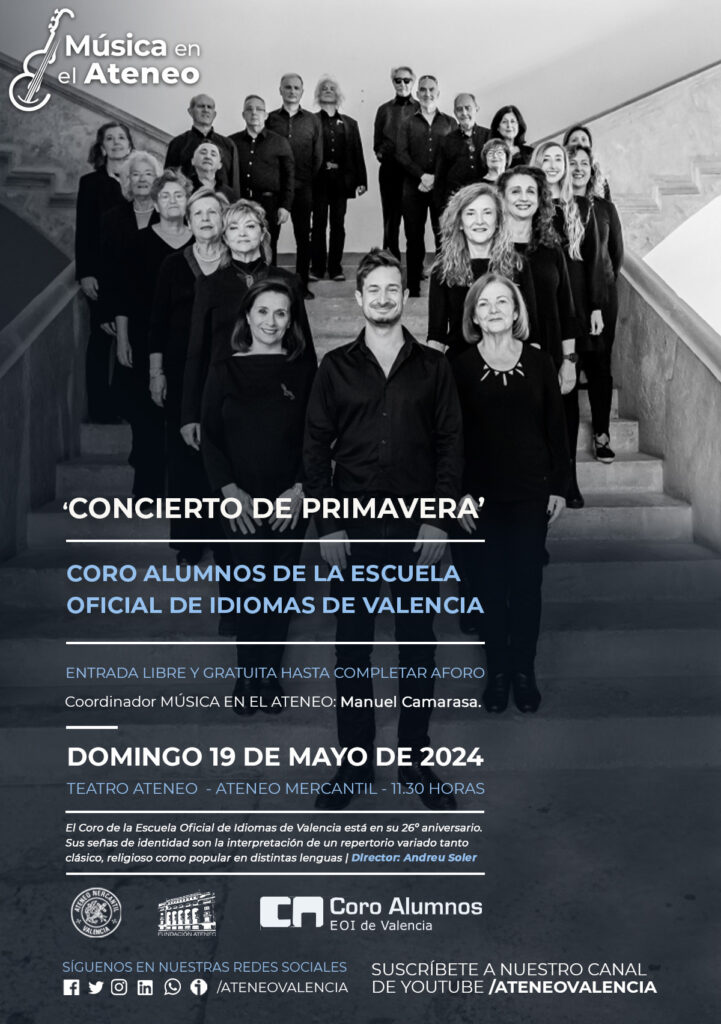 La Fundación del Ateneo Mercantil CV organiza un nuevo concierto gratuito dentro del Ciclo Música en el Ateneo el próximo domingo 19 de mayo de 2024 a las 11.30 horas en el Teatro Ateneo (3ª planta). En esta ocasión el público asistente podrá disfrutar de música coral y piano, ya que contaremos con la actuación del Coro de Alumnos de la Escuela Oficial de Idiomas de Valencia, que llega bajo la batuta del músico y pianista valenciano, Andreu Soler.