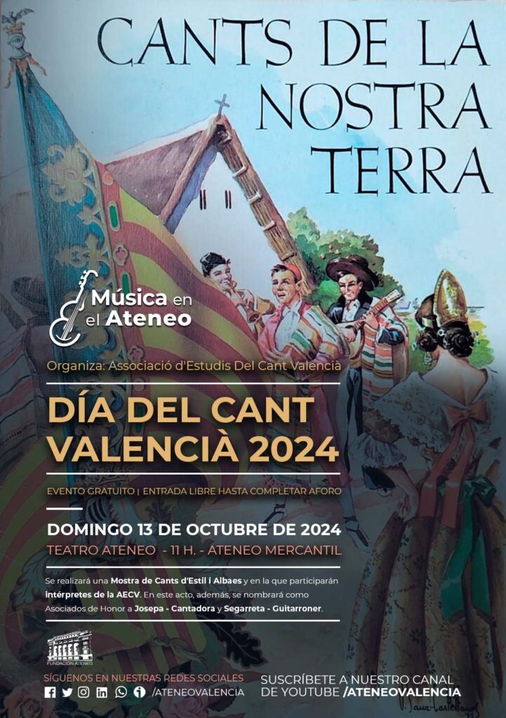 La Fundación del Ateneo Mercantil de la CV organiza junto a las Associació D'Estudis del Cant Valencià, el Dia del Cant Valencià 2024 en el Teatro Ateneo el próximo domingo 13 de octubre a las 11 horas. Un concierto en el que se realizará una Mostra de Cants d'Estil i Albaes y en la que participarán intérpretes de la AECV. En este acto, además, se nombrará como Asociados de Honor a Josepa Blasco Blasco (Josepa - Cantadora) y Vicent Segarra Martí (Segarreta - Guitarroner).