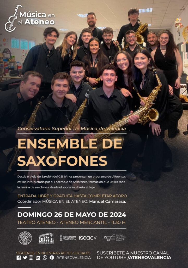 La Fundación del Ateneo Mercantil de la CV organiza un nuevo concierto de música gratuito el próximo domingo 26 de mayo de 2024 a las 11.30 horas en el Teatro Ateneo. Dentro del Ciclo Música en el Ateneo llega un concierto que realiza el Aula de Saxofón del Conservatorio Superior de Música de Valencia bajo el título "Ensemble de Saxofones".