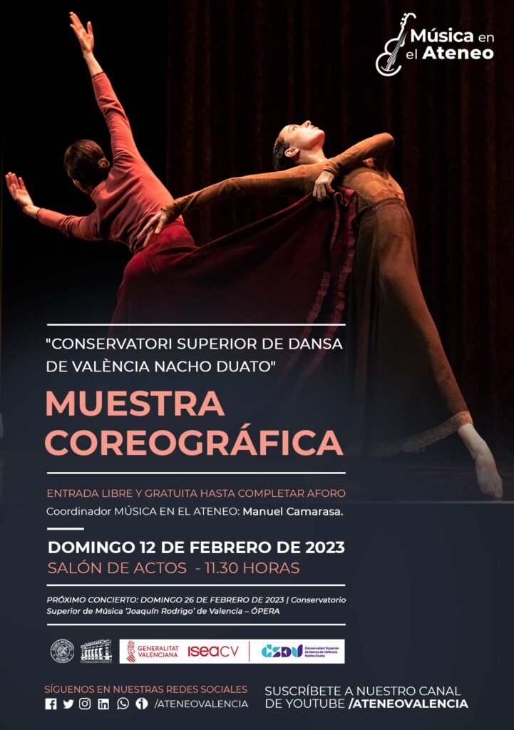 La Música en el Ateneo regresa este domingo 12 de febrero a las 11.30 horas con un evento gratuito en el que se representará una muestra coreográfica de diferentes estilos, danza contemporánea, danza clásica y danza española, presentándose coreografías tanto de repertorio como propuestas de diferentes coreógrafos y de creación propia, tanto del profesorado como del propio alumnado del CSDV Nacho Duato. Una actuación que es posible gracias a la Fundación del Ateneo Mercantil CV y al Conservatori Superior de Dansa de València Nacho Duato.
