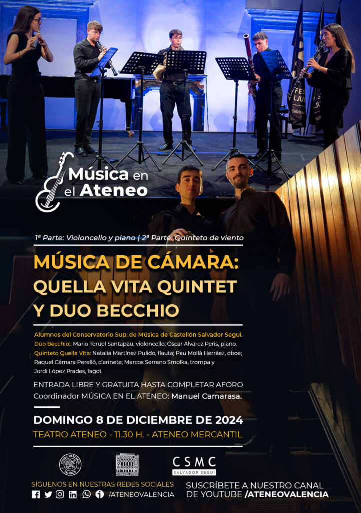 La Fundación del Ateneo Mercantil de la CV organiza un nuevo concierto dentro del ciclo Música en el Ateneo y que traerá hasta nuestro teatro el próximo domingo 8 de diciembre a las 11.30 horas a los alumnos más aventajados del Conservatorio Superior de Música de Castellón 'Salvador Seguí'. Un concierto de Música de Cámara que se dividirá en dos partes en una primera podremos disfrutar de un dúo de violoncello y piano, el Dúo Becchio, mientras que en la segunda parte llega la participación de un quinteto de viento, Quella Vita quintet.