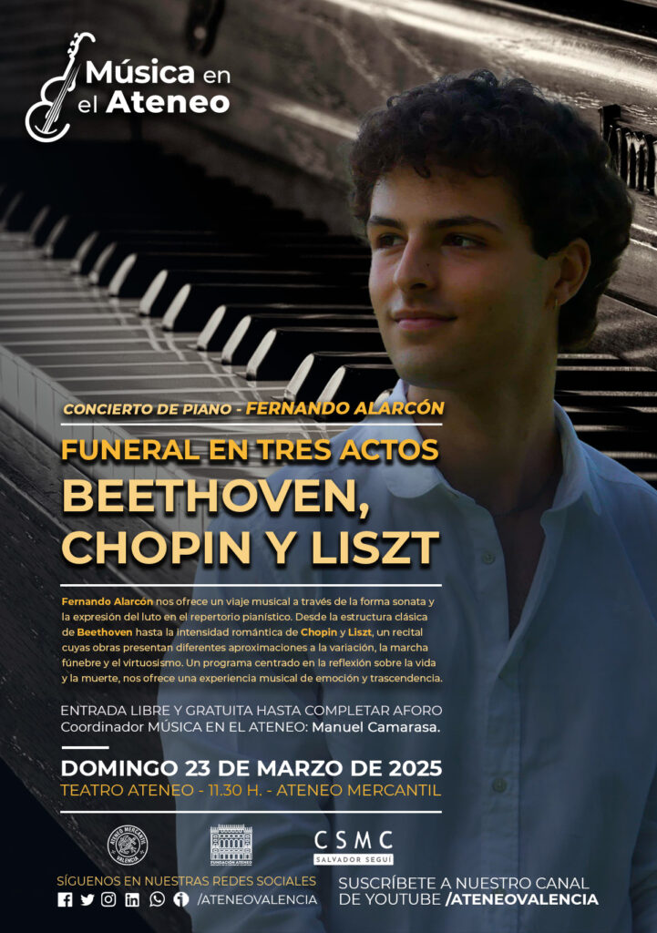 La Fundación del Ateneo Mercantil de la CV organiza un nuevo concierto gratuito dentro de Música en el Ateneo el próximo domingo 23 de marzo a las 11.30 horas en el Teatro Ateneo. En esta ocasión se desarrollará un Recital de Piano de un joven intérprete Fernando Alarcón, que ha ganado infinidad de Concursos nacionales e internacionales, tanto en solitario como en la modalidad Música de Cámara. El concierto llega bajo el título "Funeral en tres actos: Beethoven, Chopin y Liszt". La entrada es completamente libre y gratuita hasta completar aforo.